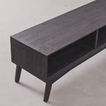 Crafted from solid wood with a rich black finish, this TV cabinet features a sleek elongated design that enhances any modern living room. The open storage compartments provide easy access to media devices and décor, while the natural wood grain detail adds warmth and sophistication. A perfect blend of style and function for contemporary homes.
